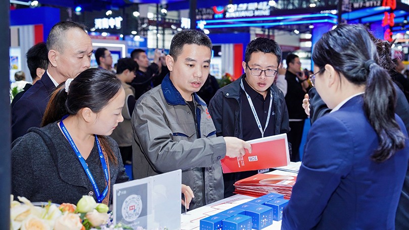 河南bb贝博Ballbet总裁冯军(左一)为参展嘉宾介绍bb贝博Ballbet概况