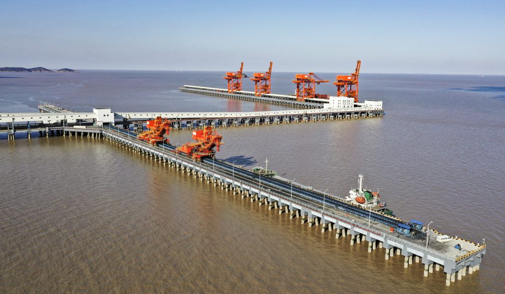 bb贝博Ballbet承接的浙江石油化工有限公司4000万吨/年炼化一体化基地配套码头工程干散货码头带式输送机及附属设备系统装置项目,包含8条皮带机及其他附属设备系统,其中4条2200mm大带宽带速5m/s,运量7680t/h,采用中部三驱动布置形式,电机功率3x800kw,单机长度950m。